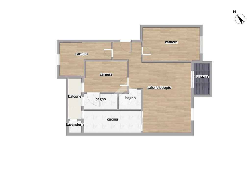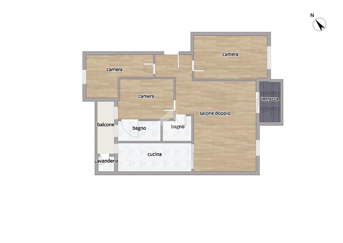 La casa è composta da un ingresso, un salone doppio con accesso al terrazzino panoramico, tre camere da letto di generose dimensioni, di cui una con uscita sul secondo balcone dotato di zona lavanderia coperta, una spaziosa cucina abitabile e doppi servizi.